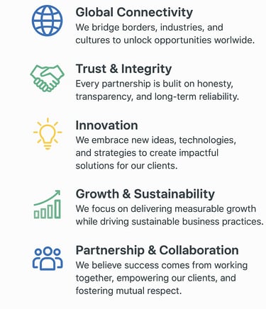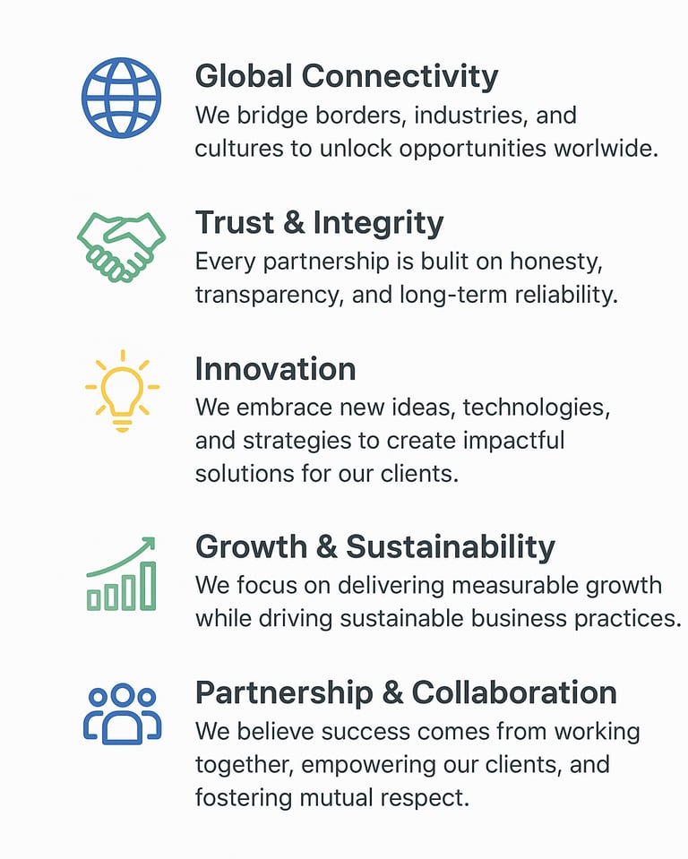 To be a globally recognized consultancy that bridges continents, industries, and ideas — becoming the first choice for organizations seeking to expand, innovate, and grow with integrity, excellence, and impact.